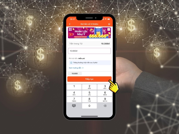 Bước 3: Hãy nhập cụ thể số tiền bạn muốn rút dựa trên số tiền trong ví thần tài và ấn vào Tiếp tục.