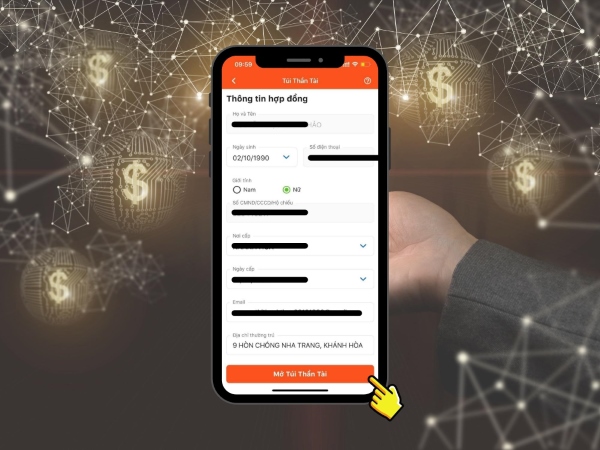 Bước 3: Tại đây kiểm tra các thông tin của hợp đồng: Họ và tên, Ngày tháng năm sinh, CMND/CCCD, số điện thoại và chọn vào mục Tôi cam kết… Sau đó ấn mở ví thần tài.