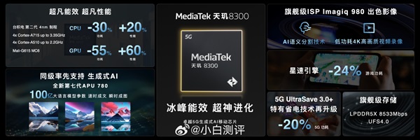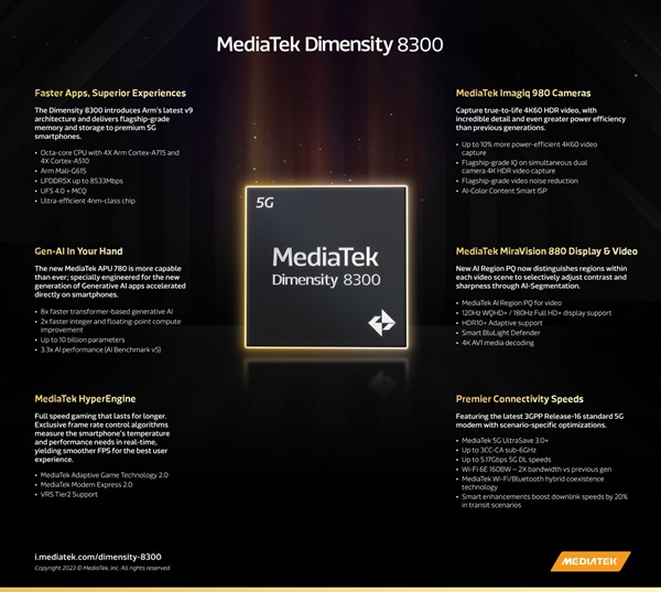 Được biết, vi xử lý Dimensity 8300 được sản xuất trên tiến trình 4 nm thế hệ thứ hai bởi TSMC gồm 8 lõi, trong đó có 4 lõi Arm Cortex-A715 và 4 lõi Cortex-A510 được xây dựng trên kiến trúc CPU v9 mới nhất bởi Arm. Giúp nâng cao hiệu suất CPU nhanh hơn 20% và nâng cao hiệu quả sử dụng năng lượng 30% so với thế hệ tiền nhiệm. Bên cạnh đó, con chip này còn đi kèm với GPU Mali-G615 MC6 giúp tăng hiệu suất cao hơn 60% và đảm bảo tiết kiệm điện tốt hơn 55%.