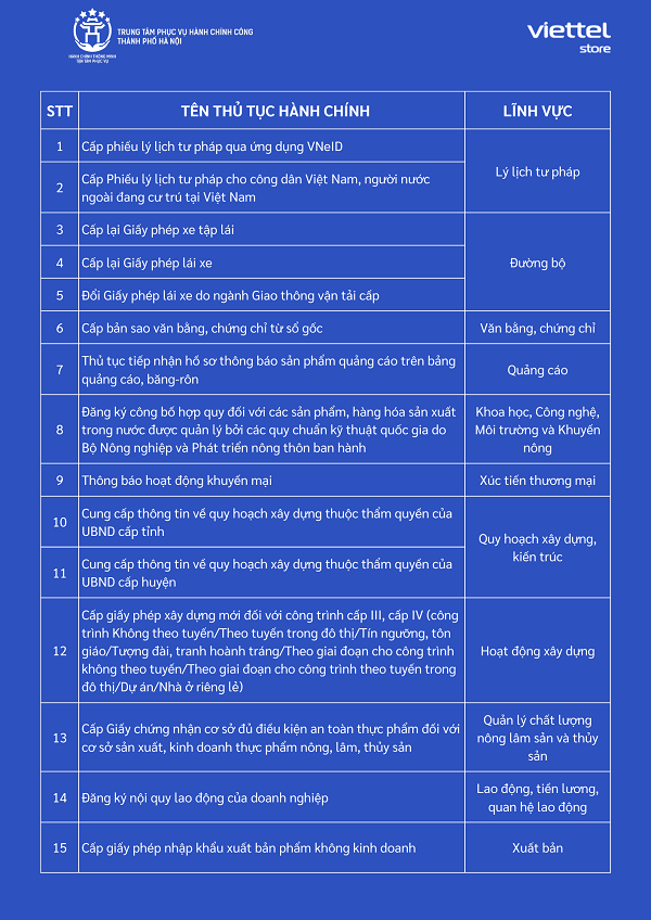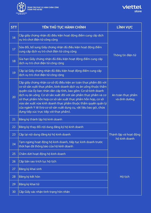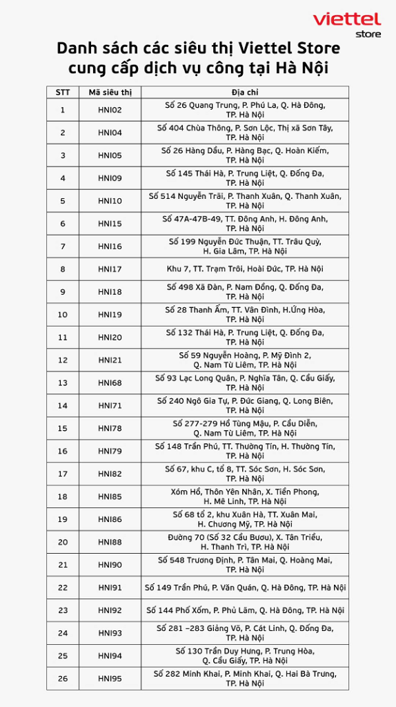 Chi tiết danh sách các siêu thị Viettel Store cung cấp dịch vụ công tại Hà Nội:
