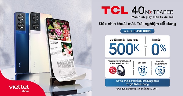 TCL 40 NXTPaper sẽ chính thức lên kệ tại Viettel Store từ ngày 17/11. Đặc biệt, trong thời gian mở bán khi mua sản phẩm này tại hệ thống các siêu thị của Viettel Store trên toàn quốc sẽ được giảm ngày 500.000 đồng giá chỉ còn 4.990.000 đồng cùng cơ hội trúng chuyến du lịch Singapore trị giá 16.000.000 đồng.