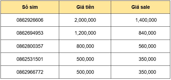 Có thể nói số điện thoại di động là người bạn đồng hành luôn gắn bó với với sự trưởng thành, thăng tiến và thành đạt trong suốt quãng đời của bạn. Và nếu bạn đang mong muốn sở hữu một số điện thoại đẹp đem đến vận may cho bản thân, thì hãy nhân cơ hội sim số đầu 0862** được giảm 30% lựa chọn ngay nhé!