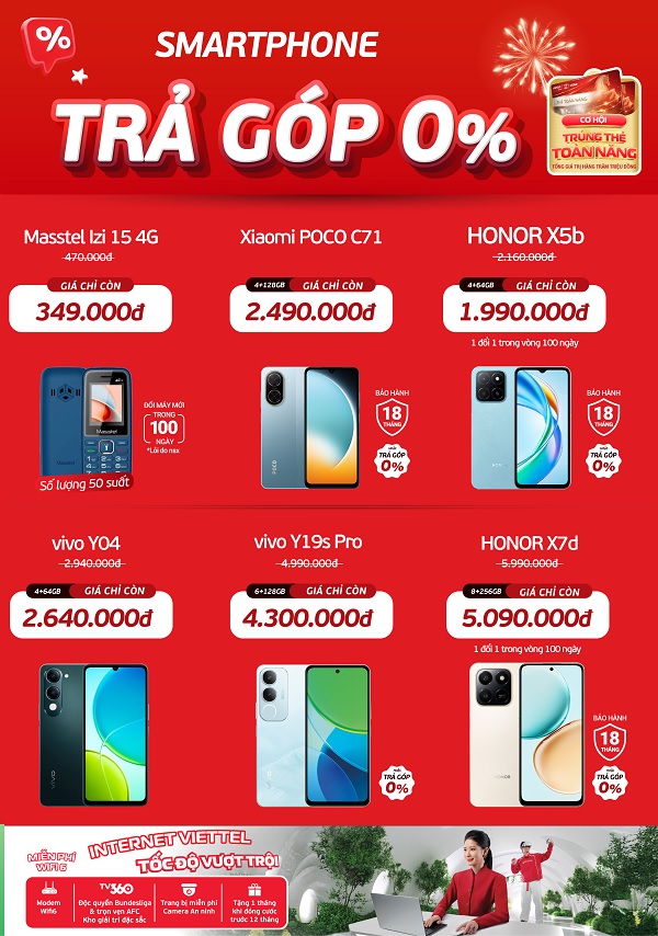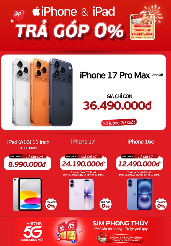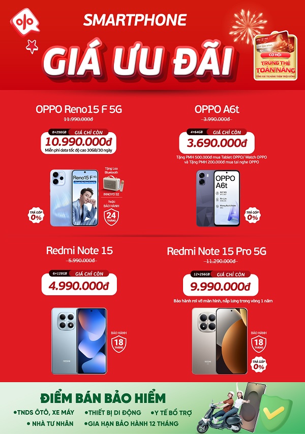 Nhân dịp này, khách hàng có cơ hội sở hữu điện thoại với mức giảm giá lên đến 12 triệu đồng, hỗ trợ trả góp 0% linh hoạt. Bên cạnh đó, loạt phụ kiện được bán với giá cực ưu đãi chỉ từ 29K. Đặc biệt, khách mua sắm còn được tặng SIM phong thủy kèm dung lượng data 5G lên tới 500GB, đồng thời có cơ hội tham gia bốc thăm trúng thưởng với giải thưởng là thẻ toàn năng trị giá lên đến hàng trăm triệu đồng.
