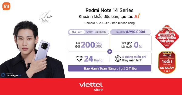 Từ ngày 11/01 đến hết ngày 28/02/2025, khi chọn mua bộ đôi siêu phẩm “Khoảnh khắc độc bản, tạo tác AI” đến từ nhà Xiaomi là Redmi Note 14 và Redmi Note 14 Pro Plus 5G tại hệ thống các siêu thị Viettel Store bạn sẽ được mua với giá giảm chỉ còn 4.990.000 đồng cùng ưu đãi hấp dẫn đi kèm. Xem chi tiết ngay!