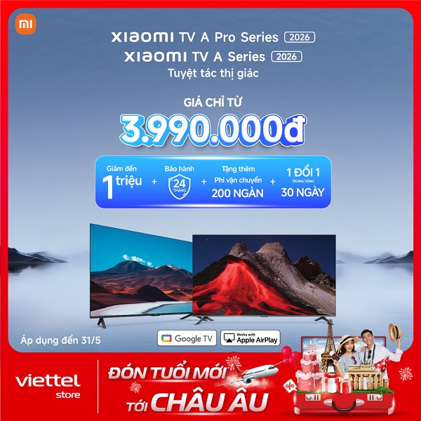 Từ ngày 15/05, Viettel Store chính thức mở bán Xiaomi TV A & A Pro Series 2026 – “Tuyệt tác thị giác” giá chỉ từ 3.990.000đ. Đặc biệt, trong thời gian mở bán từ nay đến hết 31/05/2025 khi đặt mua dòng TV mới này của Xiaomi bạn sẽ được giảm ngay đến 1.000.000đ cùng ưu đãi bảo hành 24 tháng.