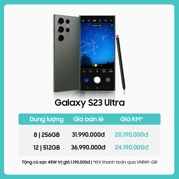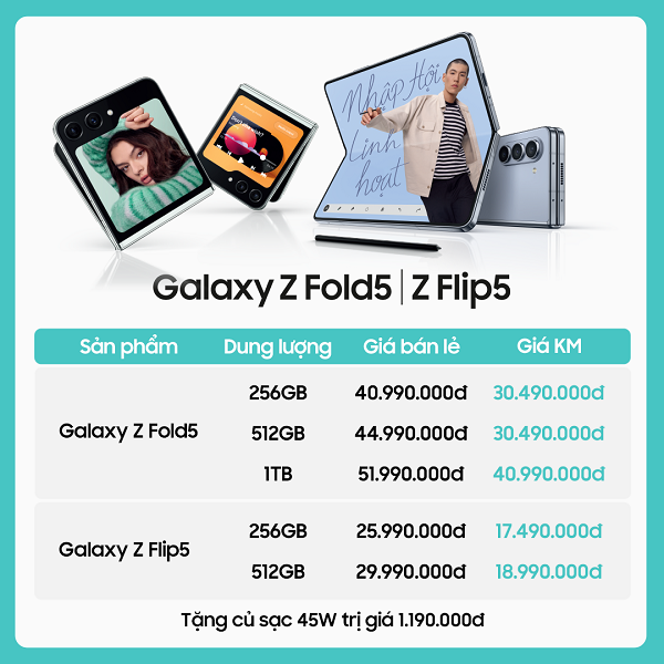 – Ưu đãi đến 12,5 triệu | Giảm đến 50%| Tặng củ sạc 45W trị giá 1.190.000đ áp dụng cho KH mua Z Fold5| Z Flip5, S23 series tại 14 siêu thị