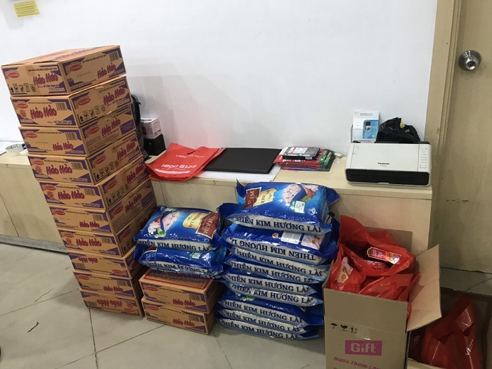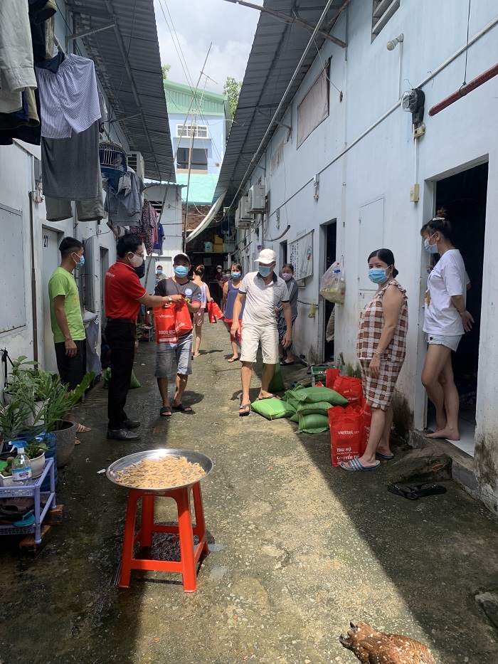 Nhóm thiện nguyện phát quà và lương thực thiết yếu như: Gạo, mỳ tôm, dầu ăn, nước mắm,…cho các hộ gia đình có hoàn cảnh đặc biệt khó khăn trong khu xóm trọ nghèo, cán bộ nhân viên của Viettel Store chưa về được quê do dịch bệnh.