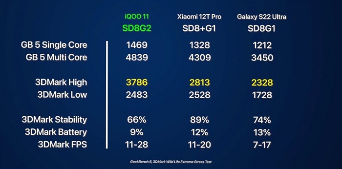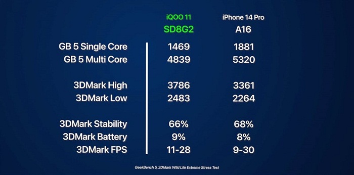 Kết quả trên cho thấy điểm đồ hoạ cùng với khả năng xử lý của con chip Snapdragon 8 Gen 2 có phần vượt trội so với các bản tiền nhiệm, song độ ổn định chưa thật sự cao, có thể do iQOO 11 chưa được tối ưu tốt với con chip này. Khi so sánh với Apple A16 Bionic, Snapdragon 8 Gen 2 tỏ ra không quá thua kém gì. Nhìn chung, đây vẫn là một con chip mạnh mẽ và sẽ mang đến cho iQOO 11 một hiệu năng rất tốt.