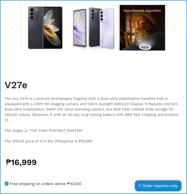 Vivo V27e chính thức được trình làng vào tháng 3 và tại buổi ra mắt hãng đã công bố giá bán là 289 USD (khoảng 6,8 triệu đồng). Tuy nhiên, mới đây chúng tôi đã kiểm tra giá bán của V27e trên website của Vivo tại Philippines thì con số là 16.999 PHP (xấp xỉ 7,2 triệu đồng), cao hơn mức giá hãng đã công bố.