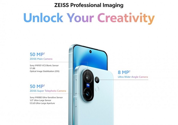 Điểm nhấn đặc biệt của Vivo X200 FE chính là hệ thống camera hợp tác cùng thương hiệu ZEISS danh tiếng. Camera chính Sony IMX921 50MP hỗ trợ chống rung quang học OIS, kết hợp camera tele Sony IMX882 50MP với khả năng zoom quang học 3x và camera siêu rộng 8MP, mang lại những bức ảnh sắc nét ở mọi góc độ.