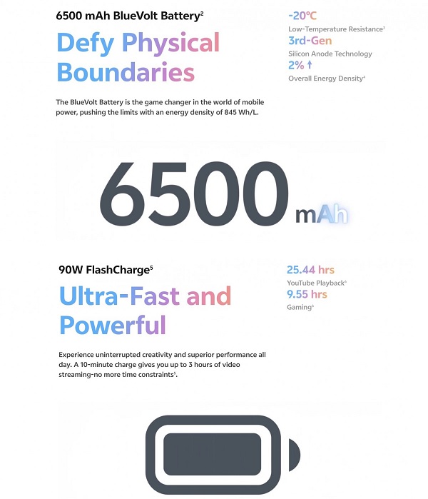 Vivo X200 FE lộ diện với viên pin BlueVolt dung lượng 6.500 mAh, cung cấp thời gian sử dụng ấn tượng: 25.44 giờ xem YouTube hoặc 9.55 giờ chơi game liên tục. Công nghệ sạc nhanh 90W cho phép nạp đầy năng lượng chỉ trong thời gian ngắn, sạc 10 phút có thể dùng tới 3 giờ xem video, giúp bạn luôn sẵn sàng mọi lúc mọi nơi.