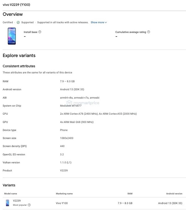 Vivo Y100 lộ diện trên cơ sở dữ liệu của Geekbench, Google Play Console và BIS với vi xử lý Dimensity 900, RAM 8GB. Điều này chứng tỏ ngoài là một chiếc smartphone giá rẻ, Y100 còn sở hữu cấu hình rất ấn tượng.