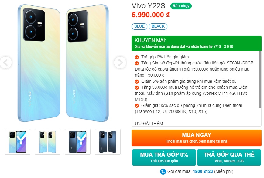 Hiện Vivo Y22s phiên bản RAM 8GB, ROM 128GB được bán tại hệ thống siêu thị của Viettel Store là 5.990.000 đồng. Ngoài ra, khi mua Y22s tại đây khách hàng còn nhận được rất nhiều ưu đãi hấp dẫn như (áp dụng từ 7/10 đến 31/10/2022):