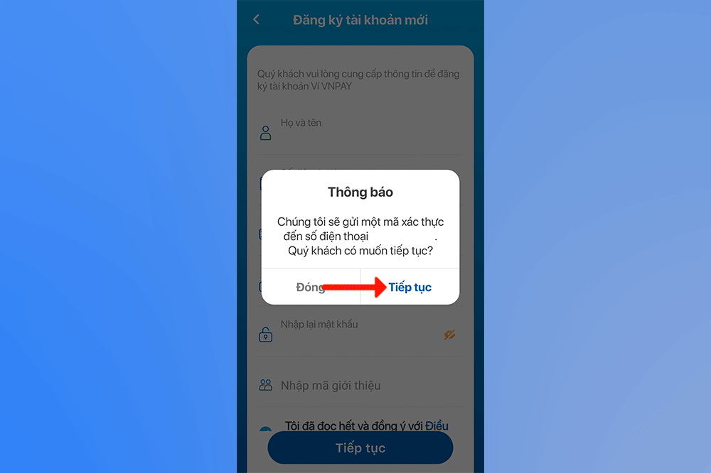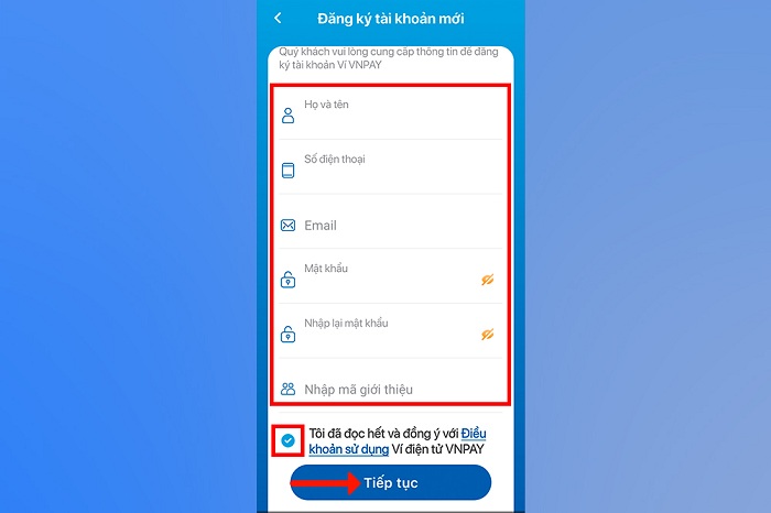Bước 3: Điền các thông tin cần thiết vào ô trống và nhấn tích vào ô “Đồng ý với điều khoản” -> nhấn “Tiếp tục”.