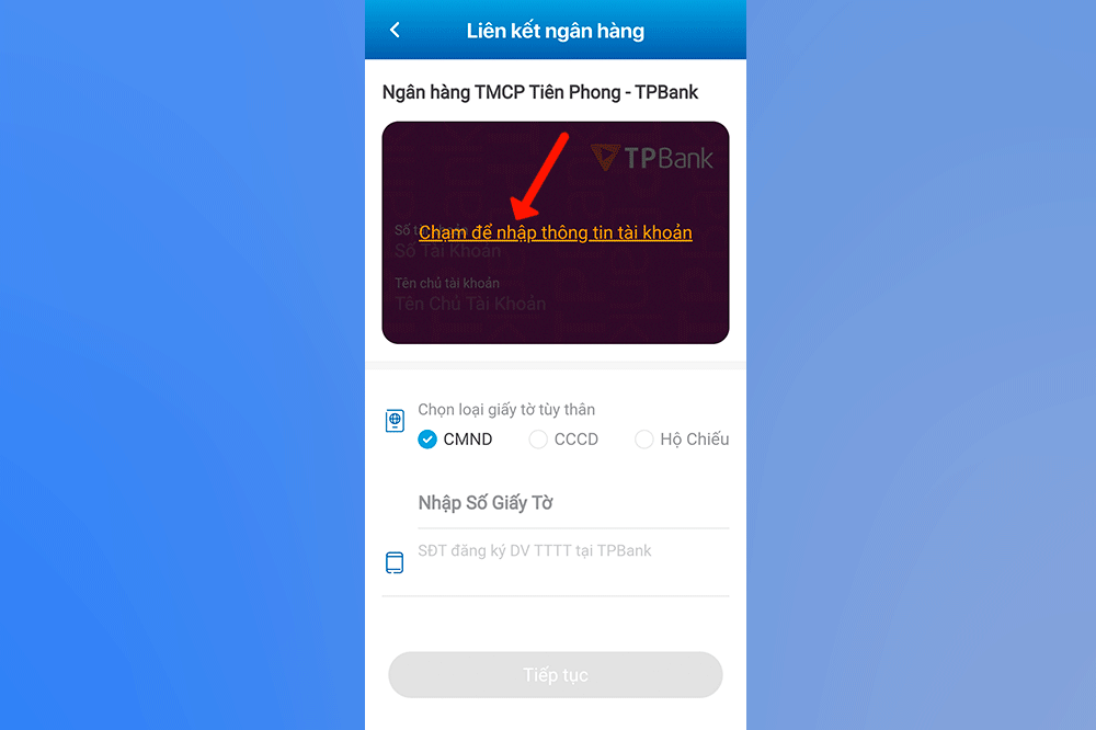 Bước 4: Sau đó tiếp tục nhấn vào “Chạm để nhập thông tin tài khoản”. Nhập số thẻ hoặc là tài khoản ngân hàng, Tên chủ thẻ/tài khoản, nhập số giấy tờ tùy thân -> chọn “Tiếp tục”. Sau đó nhập các thông tin Ví VNPAY yêu cầu là bạn đã liên kết với ngân hàng xong.
