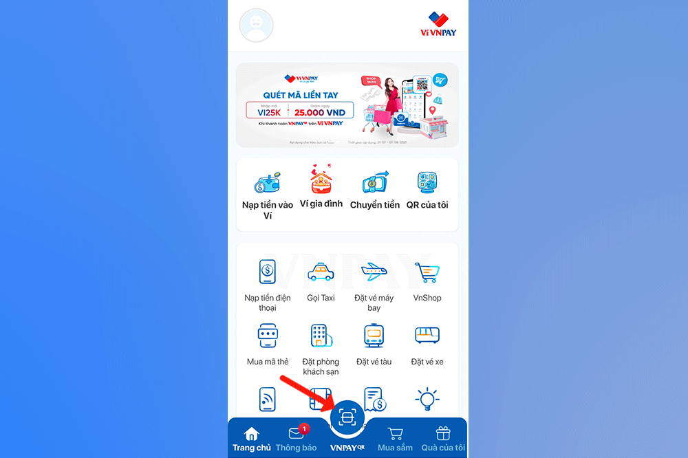 Bước 1: Mở ứng dụng VNPAY, trong giao diện chính bạn hãy chọn vào biểu tượng mã QR ngay chính giữa của thanh menu phía dưới.