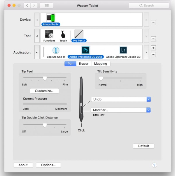 Trong phần mềm Photoshop sẽ mang đến trải nghiệm linh hoạt cao nhất khi sử dụng Wacom. Với nút thiết lập dưới đây, giữ nút dưới cùng và độ dày sẽ biến đổi khi di chuyển bút lên/ xuống và kích thước brush sẽ thay đổi khi di chuyển theo chiều từ trái sang phải.