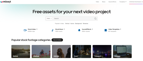 Mixkit.co là website cung cấp miễn phí stock video, sound effects, video template và nhiều tài nguyên khác để thiết kế video motion graphic ấn tượng. Nổi bật với kho tàng khổng lồ và đa dạng, Mixkit giúp bạn dễ dàng tìm kiếm video, nhạc, hiệu ứng âm thanh, template, hình ảnh… theo chủ đề mong muốn. Đặc biệt, bạn không cần đăng ký hay đăng nhập để sử dụng dịch vụ hoàn toàn miễn phí.