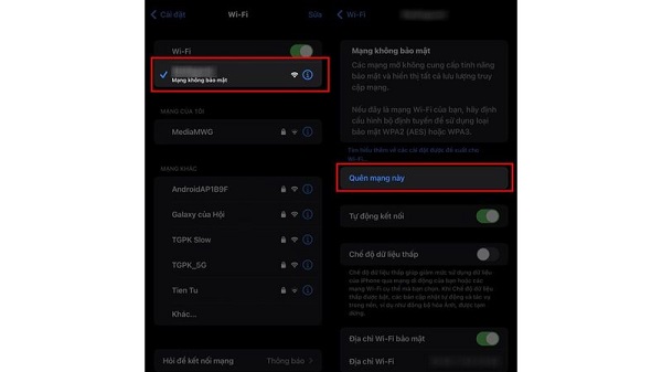 Để quên WiFi người dùng hãy vào phần cài đặt WiFi >> nhấn chọn vào dấu chữ i phía sau WiFi đang kết nối >> Quên mạng này đi là xong. Điều này cũng sẽ giúp người dùng có thể biết chắc chắn lỗi đến từ đâu.