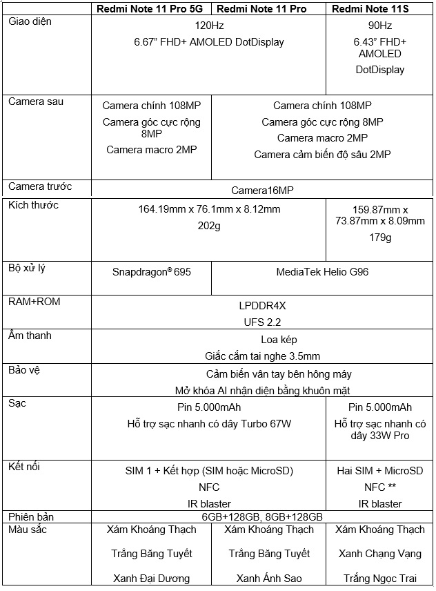 Các thông số kĩ thuật chính của các sản phẩm dòng Redmi Note 11