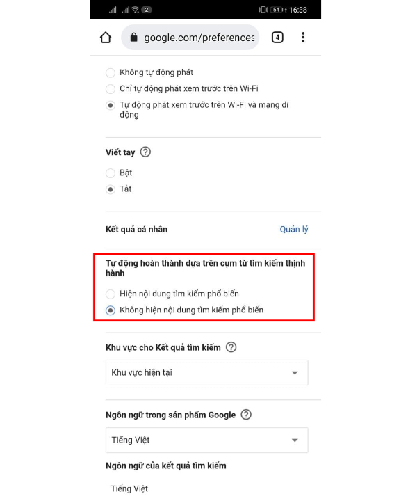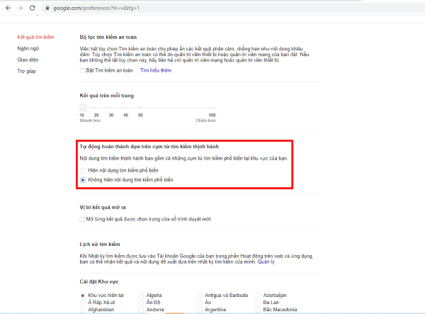 Bước 3: Tìm đến phần “Tự động hoàn thành dựa trên cụm từ tìm kiếm thịnh hành” và chọn tùy chọn “Không hiển thị nội dung tìm kiếm phổ biến” để tắt tính năng này.