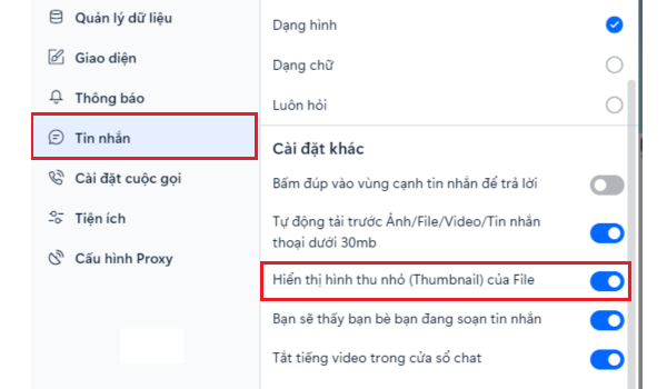 Nếu ảnh trong Zalo không hiển thị hình thu nhỏ (Thumbnail), bạn có thể điều chỉnh cài đặt như sau:
