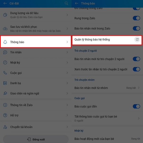 Tiếp theo, tìm đến mục “Thông báo” -> chọn vào mục “Quản lý thông báo hệ thống” và sau đó kiểm tra tất cả các công tắc thông báo xem đã được bật hay chưa. Nếu chưa thì bật chúng lên. Bên cạnh đó, bạn có thể truy cập vào mục “Messages” để xem nó đã được cấp quyền thông báo chưa.